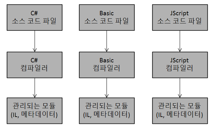컴파일의 결과물은 선택한 언어와 상관없이 모두 관리되는 모듈(managed module)의 형태로 완성된다. 관리되는 모듈의 파일 포맷은 표준 32비트 PE32 혹은 포쥰 64비트 PE32+의 형태이며, 이는 CLR이 실행시킬 수 있는 실행 파일 포맷이기도 하다.