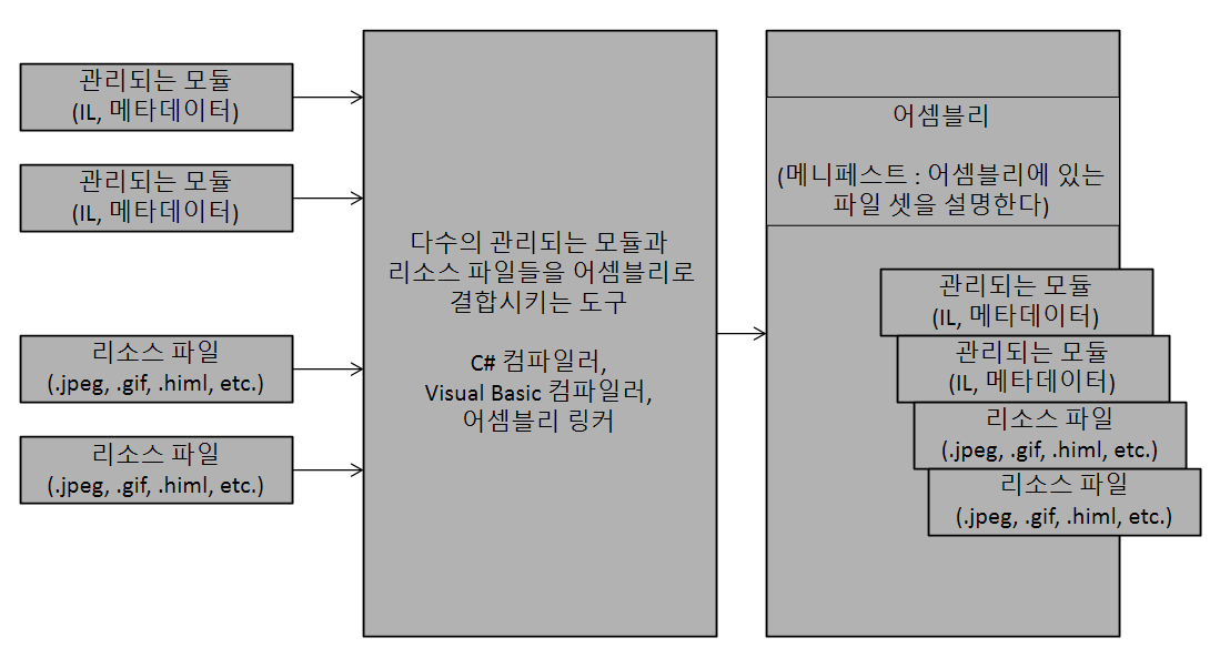 CLR의 작업 대상은 모듈이 아니고 바로 어셈블리이다. 어셈블리란 하나 이상의 모듈 혹은 리소스 파일로 구성된 논리적인 파일의 그룹을 의미하며 재사용, 보안, 버전 관리의 단위이다. CLR의 세계에서는 어셈블리를 흔히 컴포넌트라고 부르기도 한다.