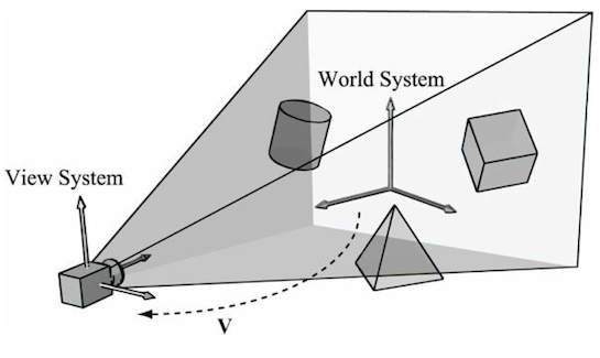 월드 스페이스로 변환되었다면, 이를 카메라 스페이스로 한번더 변환해주어야한다. 카메라는 원점에만 있는 것이 아니고 고유의 위치와 방향을 가지고 있기 때문에 거기에 맞춰 변환해주는 뷰 트랜스폼(View transform)을 거치게 된다.