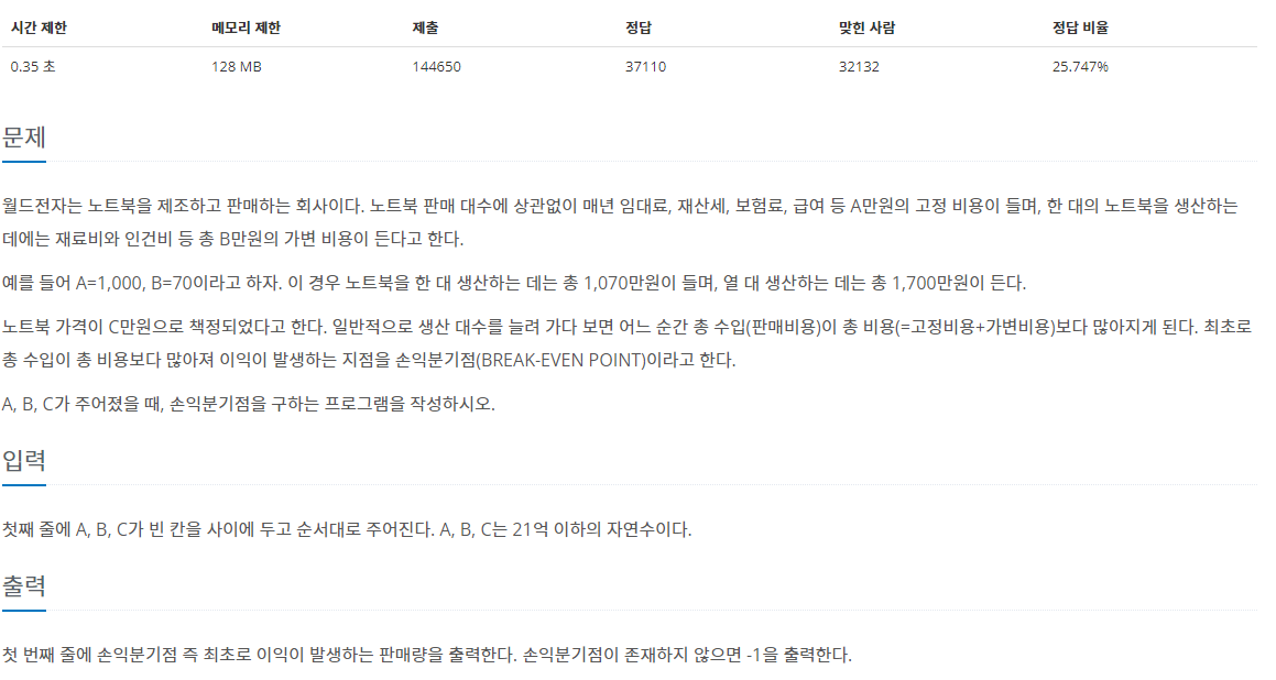 시간 제한이 0.35초인 문제였다. 처음에 시간 제한이 있는줄 모르고 손익분기점이 생길때까지 계속 더하는 식으로 풀려고 했다 그러나 그렇게 풀면 시간초과가 뜬다는 것을 알게되었다.
