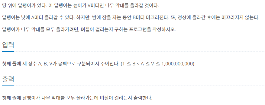 올림을 꼭 해주어야한다. 만약 문제가 5 1 6이 들어오면 V-A = 5 이고 A-B는 4다. 5/4를 나누면 1.XX 소수점이 나오는데 소수점의 의미는 달팽이가 한번에 올라갈 수 있는 거리를 적은 힘으로 올라갔다는 의미이다. 즉 소수점도 시도로 봐야한다. 따라서 올림을 해야한다.
